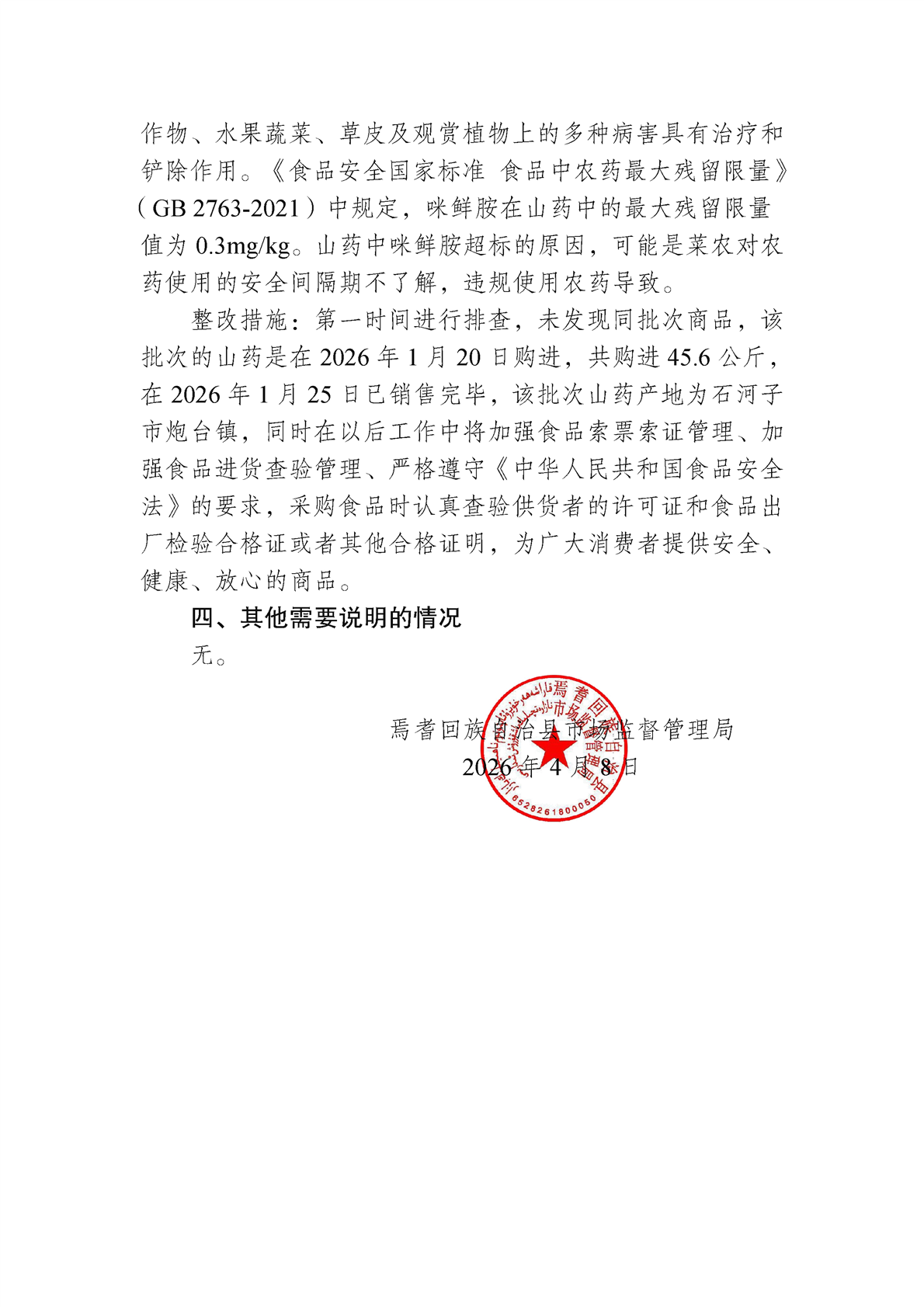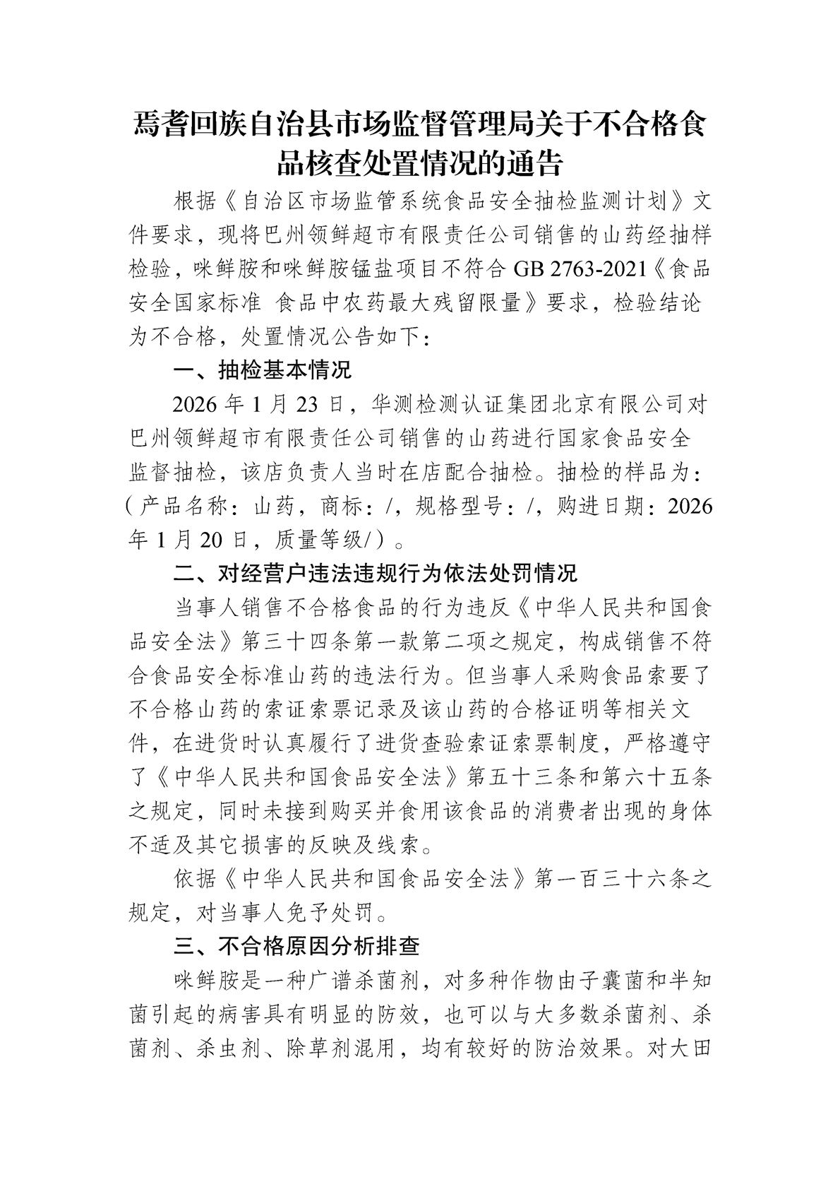 焉耆回族自治县市场监督管理局关于不合格食品核查处置情况的通告